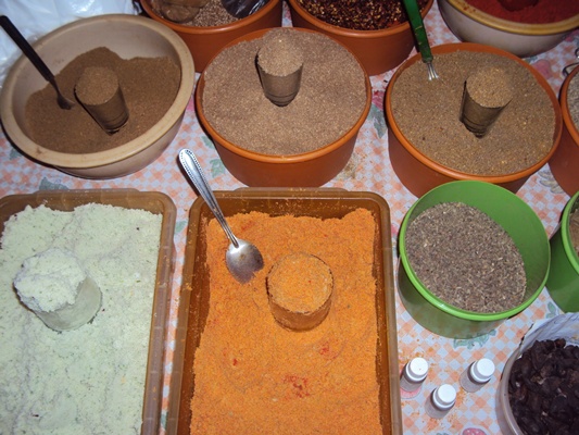Dizem que os temperos, as especiarias e as ervas aromáticas são a alma de um cozinhado. Afinal, eles têm o dom de criar ambientes aromáticos, provocando sensações gustativas que podem determinar o sucesso de um prato. Enquanto as ervas são folhas de plantas, as especiarias podem ser raízes, cascas, rebentos, sementes, frutos ou talos. O melhor é comprar as especiarias em pequenas quantidades e armazená-las em recipientes herméticos, num local frio e escuro. Quando experimentar uma erva aromática ou especiaria que desconhece, comece por usar em pequenas quantidades. Vá afinando as porções à medida que prova o cozinhado. Com a prática, irá certamente fazê-lo com conta, peso e medida. Podemos citar alguns temperos e ervas vendidos em barracas na feira; Açafrão Utilização: Arroz, frutos do mar, frango, pães, saladas, molhos de peixes, Propriedades: antioxidante, antinflamatório, auxiliar no tratamento da prisão de ventre. Alecrim Utilização: Carnes de carneiro, porco, coelho, frango e salsichas, peixes, sopas, guisados, aromatizar azeites e vinagres, bolachas, geleias, saladas de frutas, queijos, massas e molhos. Propriedades: digestivo, antioxidante, estimulante, ativador da circulação sanguínea, antidepressivo e anti-séptico. Alho Utilização: Aves, carnes, molhos em geral, refogados, sopas, recheios, saladas e frutos do mar. Propriedades: antioxidante e digestivo, melhora a circulação sanguínea e purifica o sangue. Canela